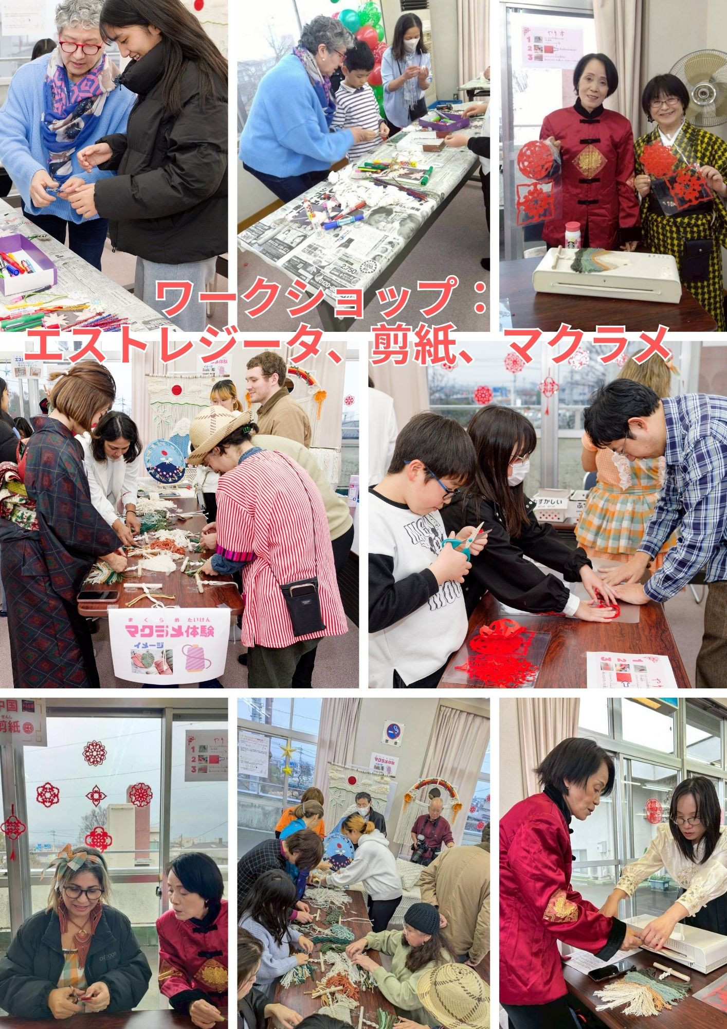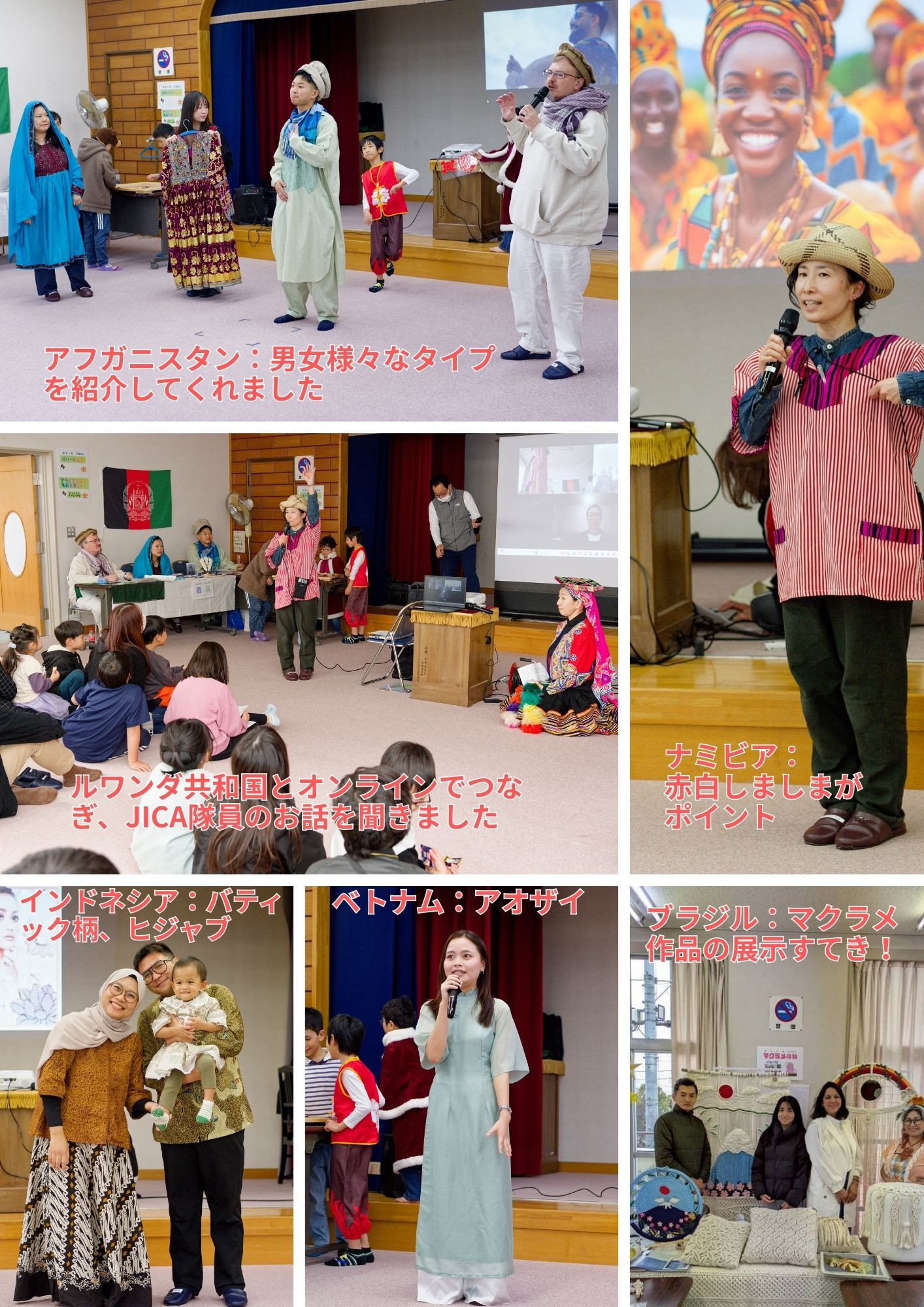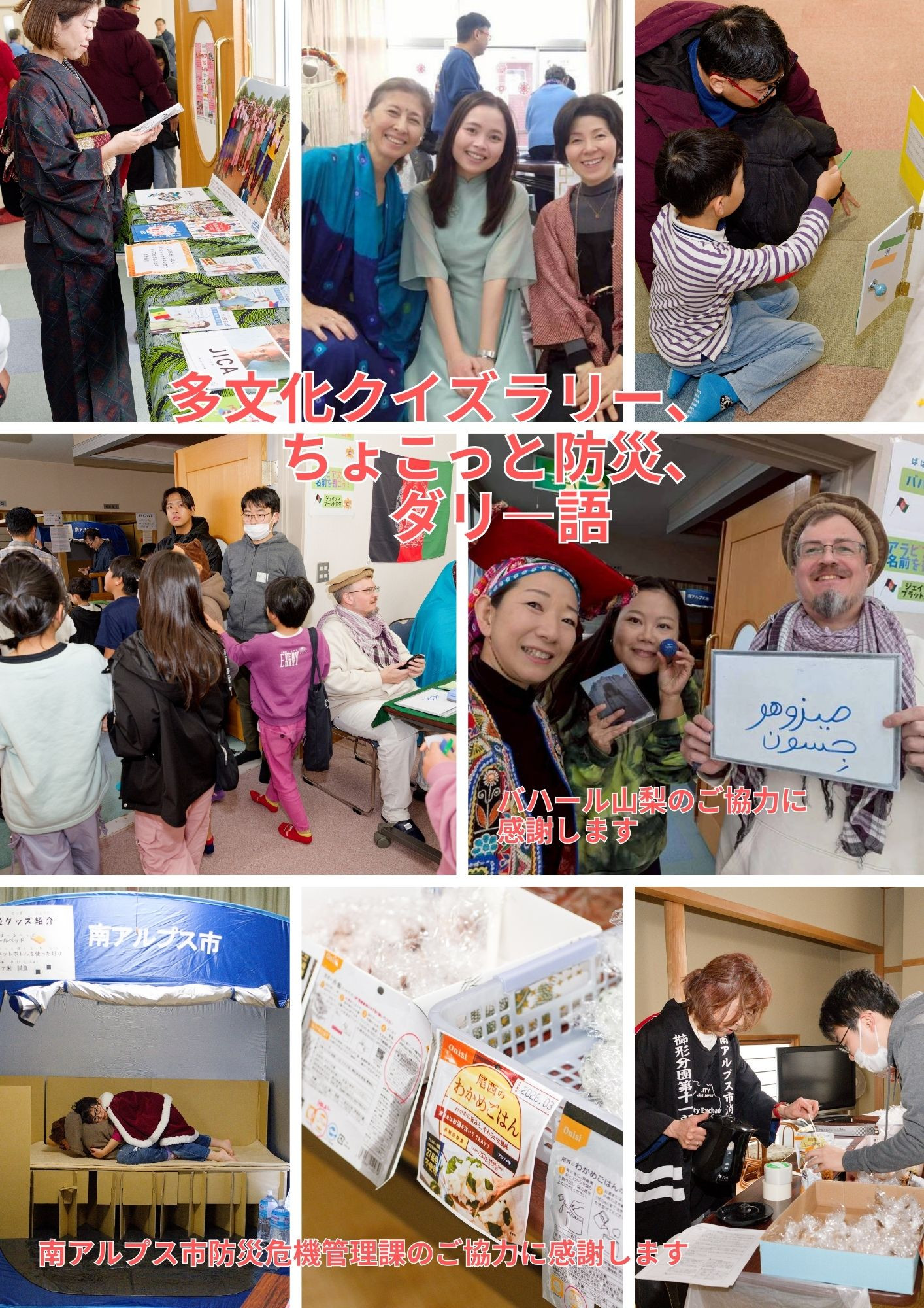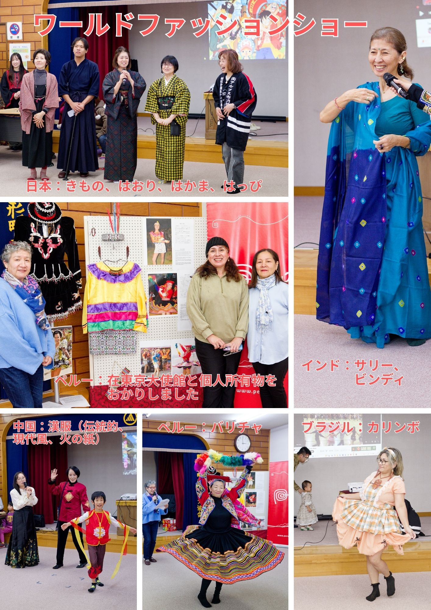 山梨学院大学原ゼミの学生によるクイズラリー、ペルー出身の方によるエストレジータを作ろう、中国出身の方による剪紙、ブラジル出身の方によるマクラメ、アフガニスタンにゆかりのある方からダリ―語を教わったり、世界各国の衣装ファッションショーなど盛りだくさんでした。